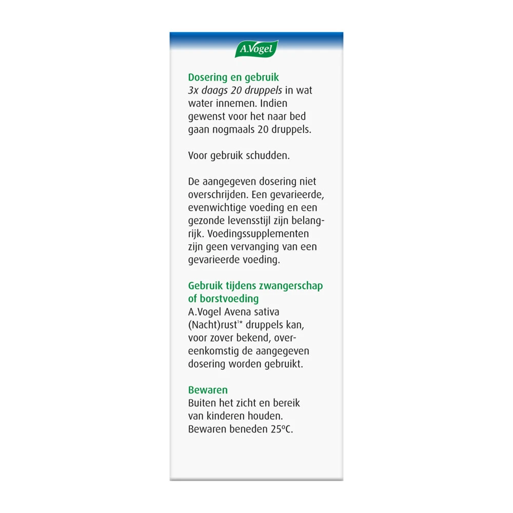 A.Vogel Avena Sativa (nacht)rust druppels A.Vogel Avena sativa (Nacht)rust1*druppels bevat Avena sativa, dat helpt om lichaam en geest te ontspannen*. Het helpt ook om lekker te slapen*.Bij innerlijke onrust*Evenwichtig in stresssituaties1*Helpt om lekker te slapen1*VoedingssupplementKruidenpreparaat1Haverextract (Avena sativa). *Gezondheidsclaim in afwachting van Europese toelating.