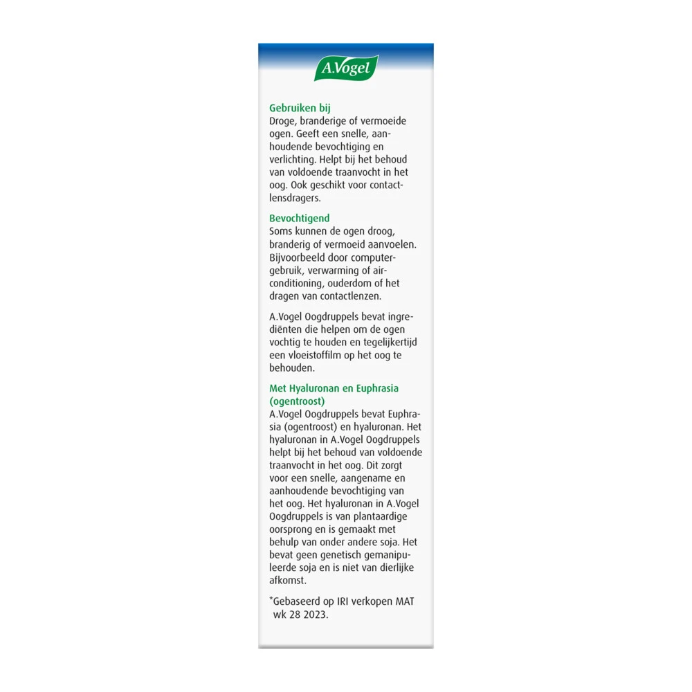 A.Vogel Oogdruppels helpt bij Droge OgenMedisch hulpmiddel A.Vogel Oogdruppels helpen bij droge, branderige of vermoeide ogen. Geeft snelle en langdurige bevochtiging en verfrissing. A.Vogel Oogdruppels bevat de natuurlijke ingrediënten Hyaluronan en Euphrasia Officinalis (ogentroost) die de ogen snel en aanhoudend bevochtigen en verlichten. De oogdruppels zijn geschikt voor gevoelige ogen en contactlensdragers.Snelle verfrissing en verlichtingAanhoudend bevochtigendOok voor gevoelige ogenG